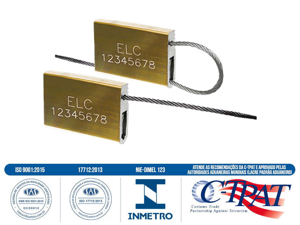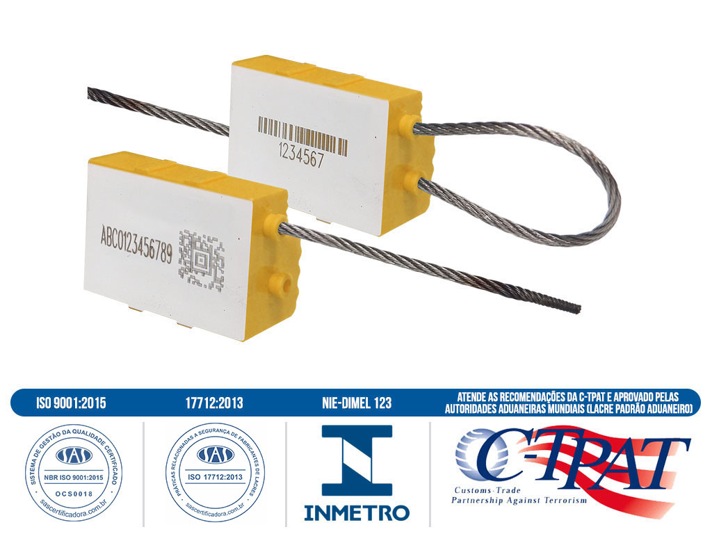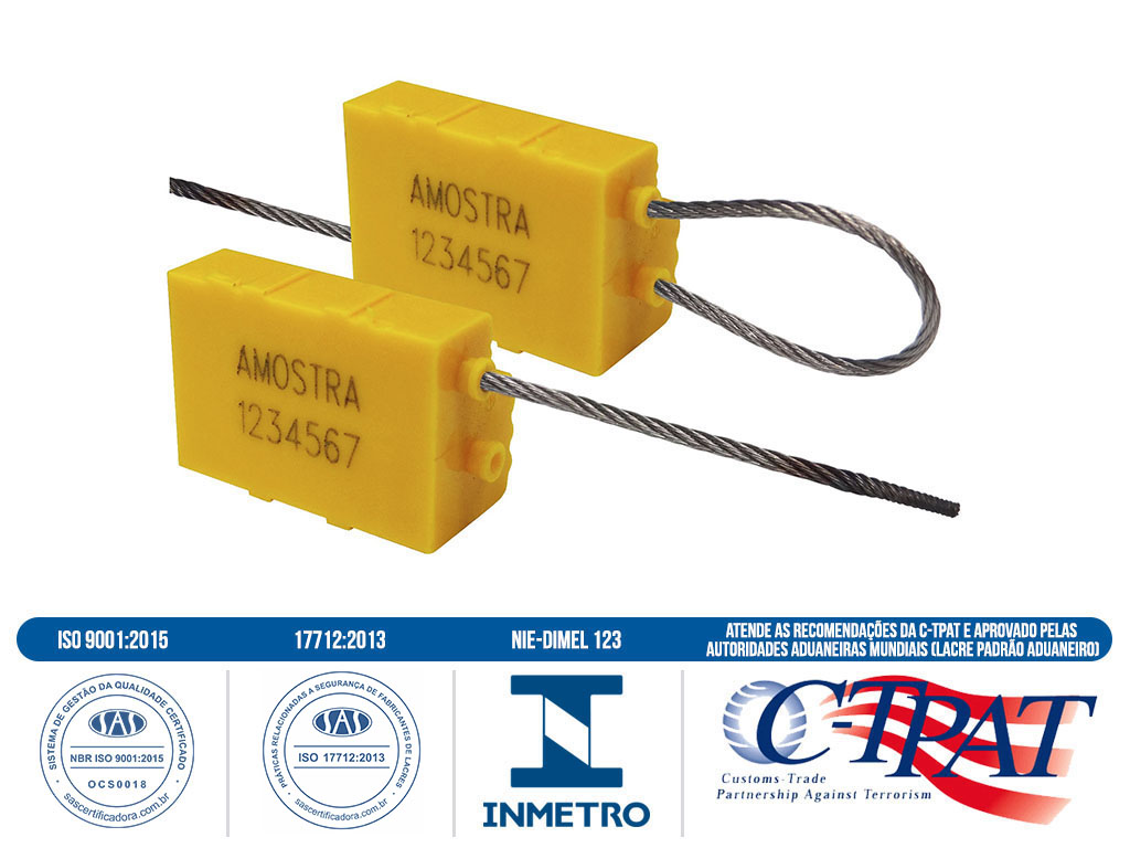 Sello metálico, cuerpo en policarbonato, mecanismo de cierre metálico, blindado e independiente, cable en acero inoxidable o galvanizado 7 hilos, con diámetro de 1,6 mm y tamaños variados según la necesidad. Resistencia a tracción 227 daN.