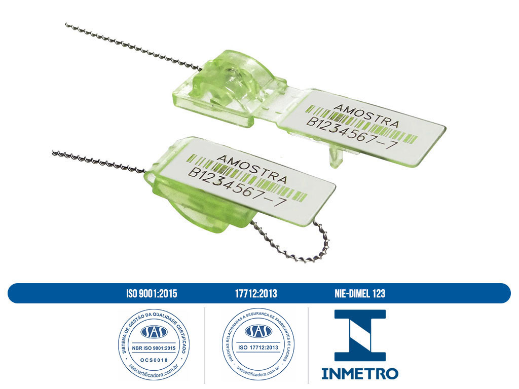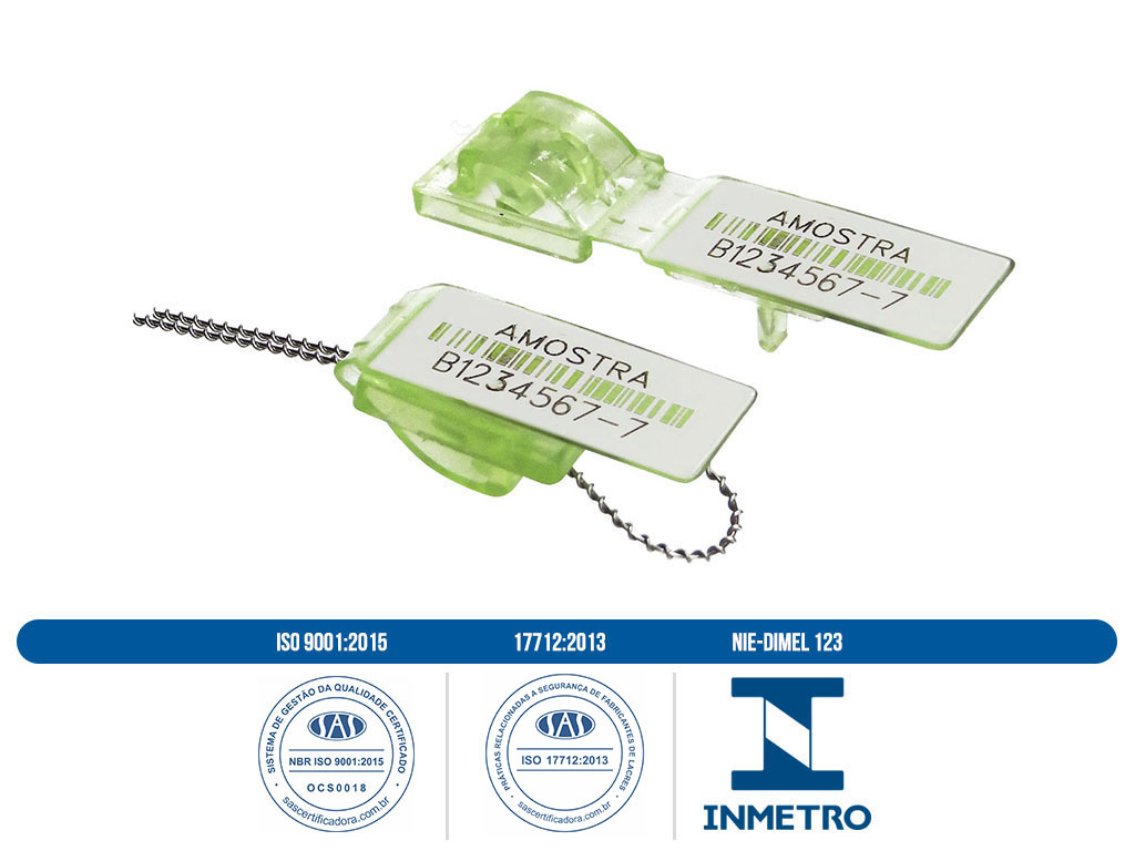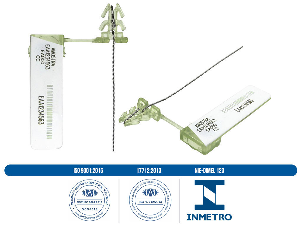 - Selo de segurança metálico semibarreira, corpo em alumínio anodizado e sistema de travamento zamac, cabo de lacração em aço inox ou galvanizado 7 fios que se desfaz com o corte impossibilitando sua recomposição, com diâmetro de 1,60 mm (outros diâmetros sob consulta) e comprimentos variados conforme necessidade. Personalização, código de barras e codificação alfanumérica gravados à laser no corpo do selo, resistência a tração mínima de 227 daN.